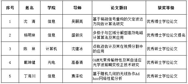 12月21日,中国电子学会在北京举办的“洞见2017中国电子信息科学家论坛”上公布了中国电子学会2014-2016年度优秀学位论文,我校5篇论文获优秀学位论文奖,其中吴嗣亮教授指导的博士生沈清的学位论文获得“优秀博士学位论文”,盛新庆教授指导的博士生杨明林的学位论文获得“优秀博士学位论文提名”,高春清教授指导的硕士生戴坤健、费泽松教授指导的硕士生丁海川、沈建冰教授指导的硕士生陈林的学位论文获得“优秀硕士学位论文”。