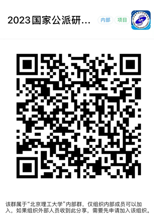 2. 请计划申报2023年国家公派研究生项目的同学,使用i北理APP扫码或点击链接(https://qr.dingtalk.com/action/joingroup?code=v1,k1,ub5/WcAG13jm6F863wCyFG67zpu/Az2Djj7sinumizs=&_dt_no_comment=1&origin=11)进入申报交流群,后续相关通知也将及时在群内同步进行通知。