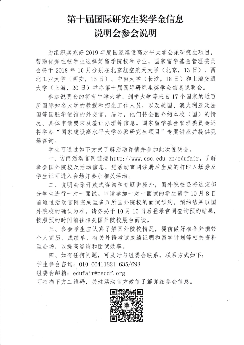 为组织实施好2019年度国家建设高水平大学公派研究生项目,帮助优秀在校学生选择好留学院校和专业,国家留学基金管理委员会将于⒛18年10月分别在北京航空航天大学(北京,13日)、西北工业大学(西安,15日)、中南大学(长沙,18日)和上海交通大学(上海,20日)举办第十届国际研究生奖学金信息说明会。参加说明会的将有牛津大学、剑桥大学等来自17个国家的近百所国际知名大学的教授和招生工作人员,以及美国、澳大利亚及法国等国驻华使馆的外交官。届时,他们将全面介绍本校(国)的情况、具体申请要求及签证办理等信息。国家留学基金管理委员会还将举办“国家建设高水平大学公派研究生项目”专题讲座并提供现场咨询。