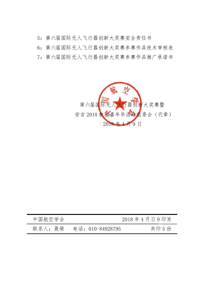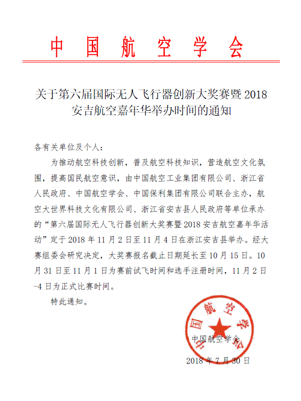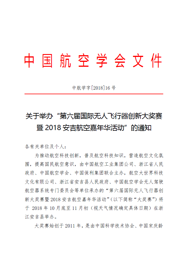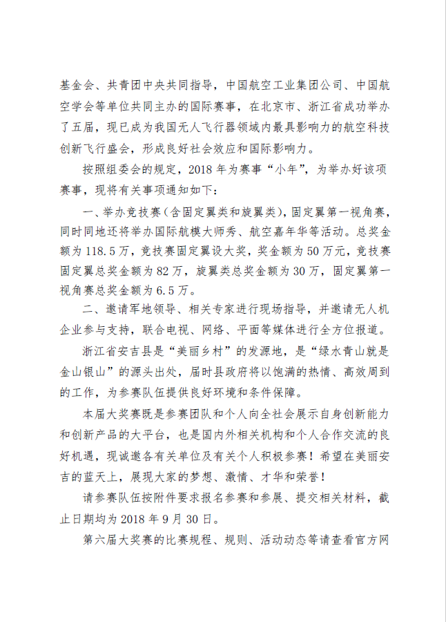 详情见大赛官网通知《关于举办“第六届国际无人飞行器创新大奖赛暨2018安吉航空嘉年华活动”的通知》: