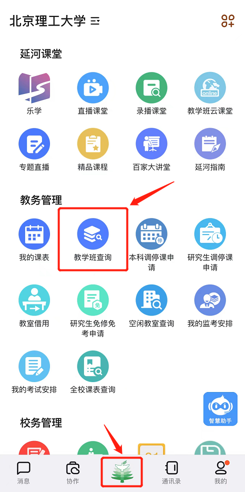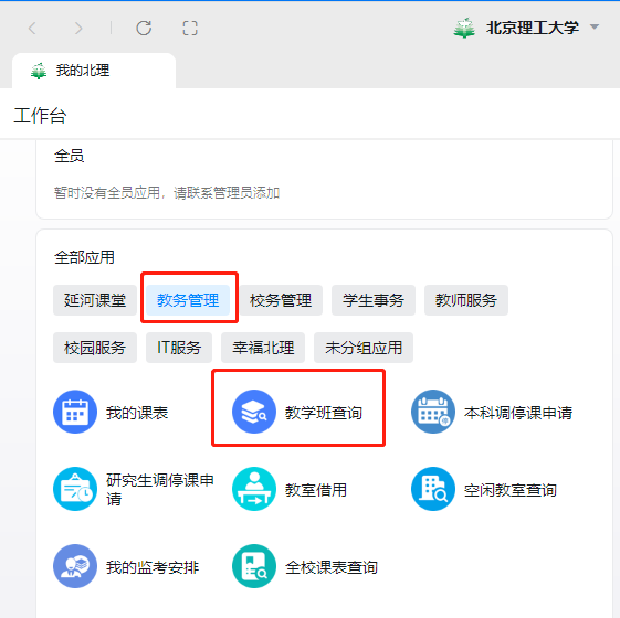 (2)进入i北理首页→工作台→教务管理→教学班查询;