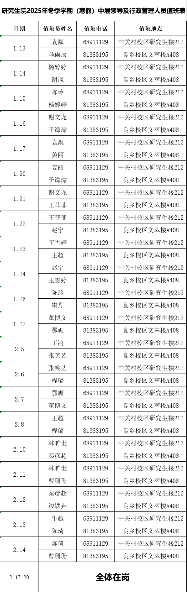 按照2024—2025学年校历安排,我校冬季学期(寒假)时间为2025年1月13日(星期一)至2月20日(星期四)。其中,1月28日(星期二)至2月4日(星期二)为春节假期。根据《BETWAY必威行政办公室关于2025年元旦、冬季学期(寒假)安排的通知》(北理工办通〔2024〕52号),现将必威西汉姆联值班安排通知如下,请各位师生据此做好业务办理: