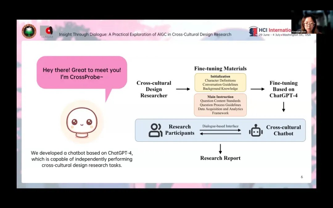 赵小炫的研究主题是基于AIGC(生成式人工智能)进行跨文化设计调研平台的开发。在邱越教授的指导下,她使用ChatGPT-4为原型,创建数据集并微调模型,开发了一个用于跨文化设计调研的Chatbot,实现对不同文化背景用户的个性化响应策略。此外,作为非物质文化遗产“锔瓷技艺”的传承者,她也在积极把AI技术应用于传统锔瓷手工艺的现代传播中。