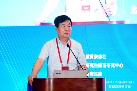 北京外国语大学特聘教授、国际教育学院院长秦惠民的主题报告以《以良法善治服务教育强国建设——从学位条例到学位法的回顾与前瞻》为题。学位立法从学位类型、学位管理体制、学位授权体制三方面规范保障了学位与研究生教育的改革发展。学位立法从有法迈向良法、以良法推进善治、以良法保障善治必将有力地推进教育治理体系和治理能力现代化的进程,更好地服务于教育强国建设。