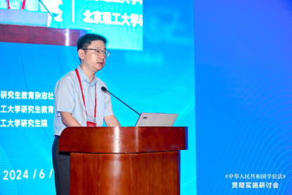 北京大学法学院教授湛中乐作《从<学位条例>到<学位法>:学位立法中的若干法律问题》的主题报告。推进《学位法》贯彻实施,关键要理解《学位法》在我国教育法律体系中的重要地位,厘清国家学位制度与大学学位制度的法理演进,进一步明晰立法目的、立法依据、适用范围,公正评价学位授予单位资格,协调好学位评定委员会与学术委员会、校院两级学位评定委员会与答辩委员会的相互关系,进而优化学位撤销条件与程序,积极开展学位法律救济。