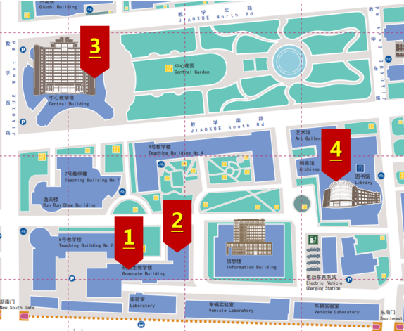 研究生楼正门一层大厅、研究生楼教师服务大厅、中心教学楼一层大厅、图书馆一层大厅