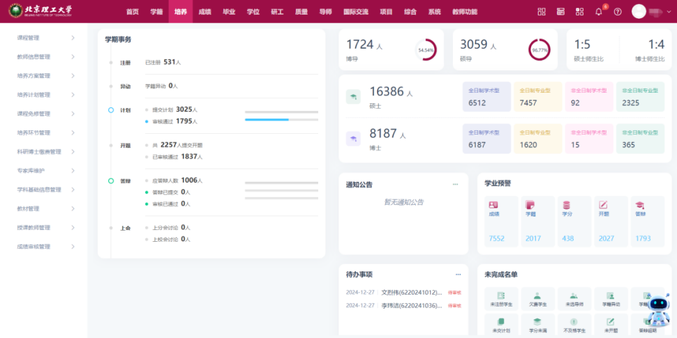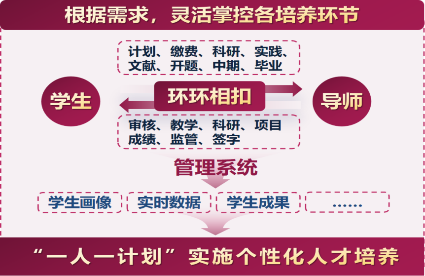 个性培养,一学生一计划。新系统注重个性化人才培养,通过灵活掌控各培养环节,实现了“一人一计划”的培养模式。学生、导师及管理人员可实时查看学生画像、学生成果及实时数据等,为个性化教学提供了有力支持。