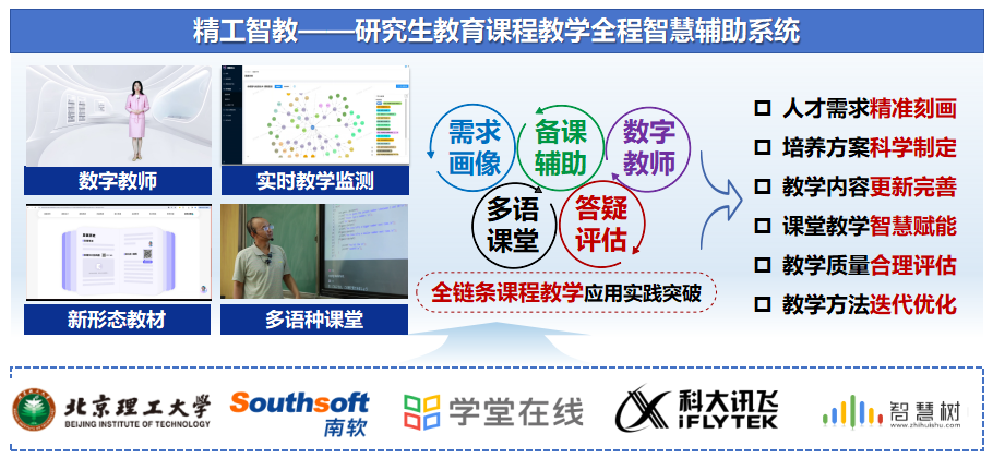 课堂学习以智提质,打造“精工智教”教学全程智慧辅助系统,从人才需求精准刻画、培养方案科学制定、教学内容更新完善,到课堂教学智慧赋能、教学质量合理评估、教学方法迭代优化等方面辅助课堂建设,贯穿课堂教学的每个环节。旨在为全校本科生、研究生和留学生教育提供“因材施教”的智能化工具,推进科教融汇、产教融合,为培养既满足实际需求又具备系统知识的拔尖创新人才提供支撑。以该工作为主题的案例已入选教育部“人工智能+高等教育”典型应用场景案例。