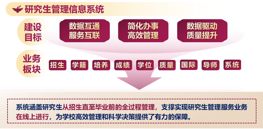 近日,经过精心筹备与建设,我校全新的研究生教育管理系统正式上线运行。该系统在研究生招生、学籍、培养、成绩管理、学位授予、导师管理等多个方面进行了全面升级,标志着学校研究生教育信息化建设迈出了重要一步。