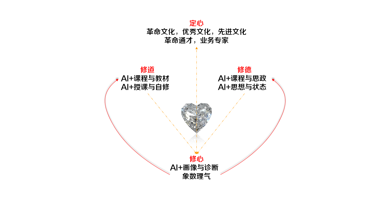 思政育人以智启智,构建AI赋能思政育人模式,铸就“革命通才、业务专家”,承传革命文化、优秀文化和先进文化,着力培养学生的科学探索、大匠运斤、钻之弥坚精神。引导学生修身齐家治国平天下,修身必先修心才能知行合一。修心需要修道和修德,当以高尚的道和德作为最高统帅时才能定心。修道可从导师授课、授业开始,修德要从思想政治开始,二者又紧密关联,修道和修德通过画像进行诊断评估,再提升演化修道和修德,学而时习之达到定心的目标。