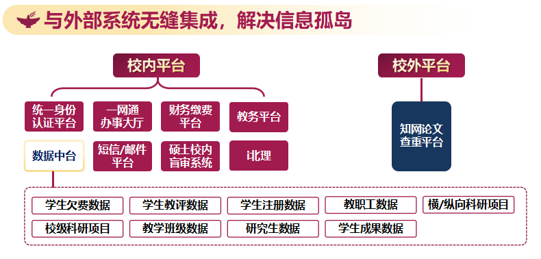 无缝集成,打破信息孤岛。新系统实现了全校数据的无缝集成,与校内统一身份认证、一网通办事大厅、财务缴费平台、一体化教学平台等多个系统实现了多类型数据交互,有效打通了业务壁垒,解决了信息孤岛问题。在校外,新系统还与知网论文查重平台实现了对接,为研究生提供了便捷的论文查重服务。此外,学校还与网络中心联合共建了研究生成果采集平台和学籍异动平台,进一步丰富了系统的功能,提升了服务水平。