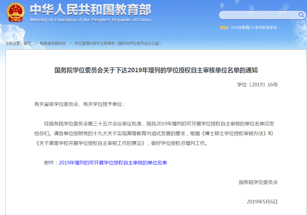 2019年5月31日,国务院学位委员会公布了2019年获得学位授权自主审核单位名单,我校名列其中成为全国31所拥有学位授权自主审核权的高校之一。获批学位授权自主审核资格后,学校今后可根据国家发展战略需要和国际科学技术前沿,灵活自主的设置学科,培养新的学科增长点,更好地服务国家发展战略。同时,学校也将有更大的自主权,围绕“优工、兴理、精文、拓医”的发展思路,优化我校学科布局,加强已有学科内涵建设,探索新兴交叉学科发展建设,更好地促进了我校世界一流大学的建设目标。
