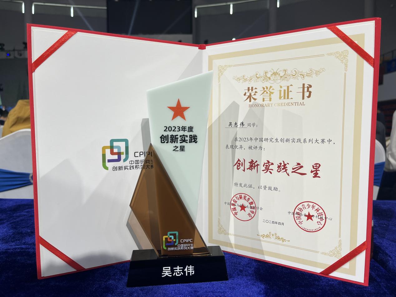 大会期间还授予了全国15支研究生团队2023年度“研究生创新实践之星”称号,我校自动化学院硕士研究生吴志伟代表团队荣获“研究生创新实践之星”荣誉称号。