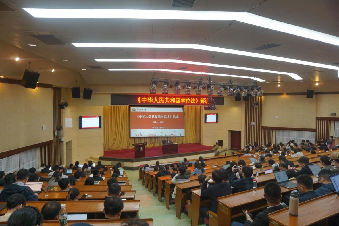 为深入贯彻《教育强国建设规划纲要(2024-2035年)》精神,切实做好《中华人民共和国学位法》的宣传贯彻工作,全力推进科学组织的“依法治教”,4月9日下午,北理工必威西汉姆联在中关村校区举办《学位法》解读专题辅导报告会,中国政法大学林华教授受邀作专题报告。学部委员、学科专业责任教授和导师代表等400余人参会。会议由必威西汉姆联副院长兼学位与学部办公室主任王晓庸主持。